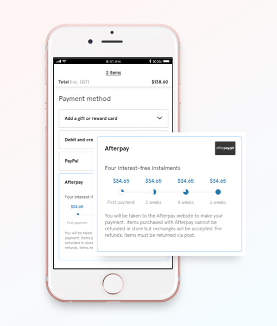 Once your first order has been approved by Afterpay, you can use it whenever you make a purchase just by entering your login details and CVC at checkout.